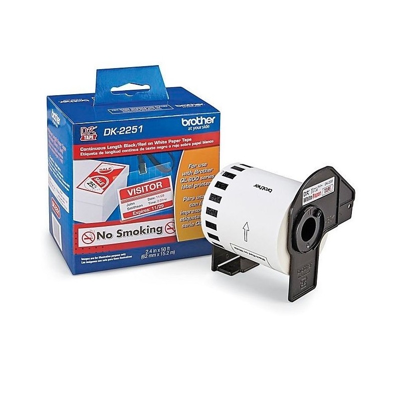 Cinta Brother DK-2251 (texto rojo y negro sobre fondo blanco) permite crear etiquetas con tamaños personalizados imprimiendo en rojo y negro. Si la longitud de la información que debe ir en tus etiquetas es variable, las cintas continuas son la mejor opción. Puedes incorporar de forma rápida y sencilla: imágenes, logotipos, códigos de barras, fechas o cualquier otra información. incorporando el color rojo para destacar la información más importante o dar un estilo propio a sus etiquetas.