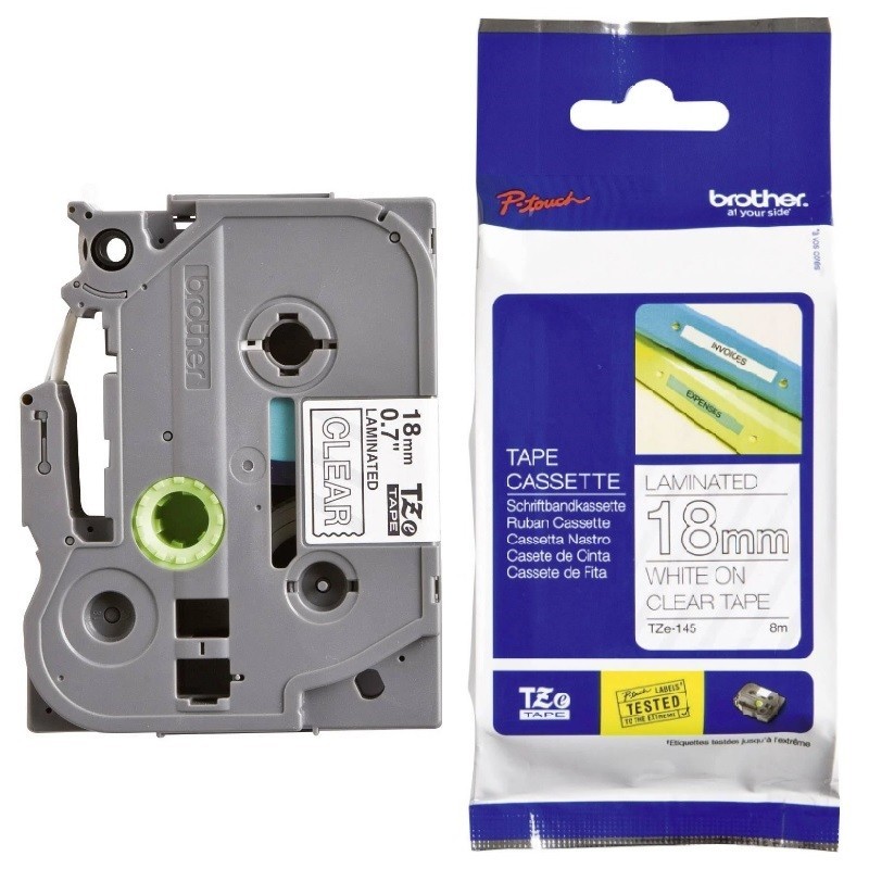 Cinta Brother Tze-145 Blanco sobre Transparente 18 mm x 8m