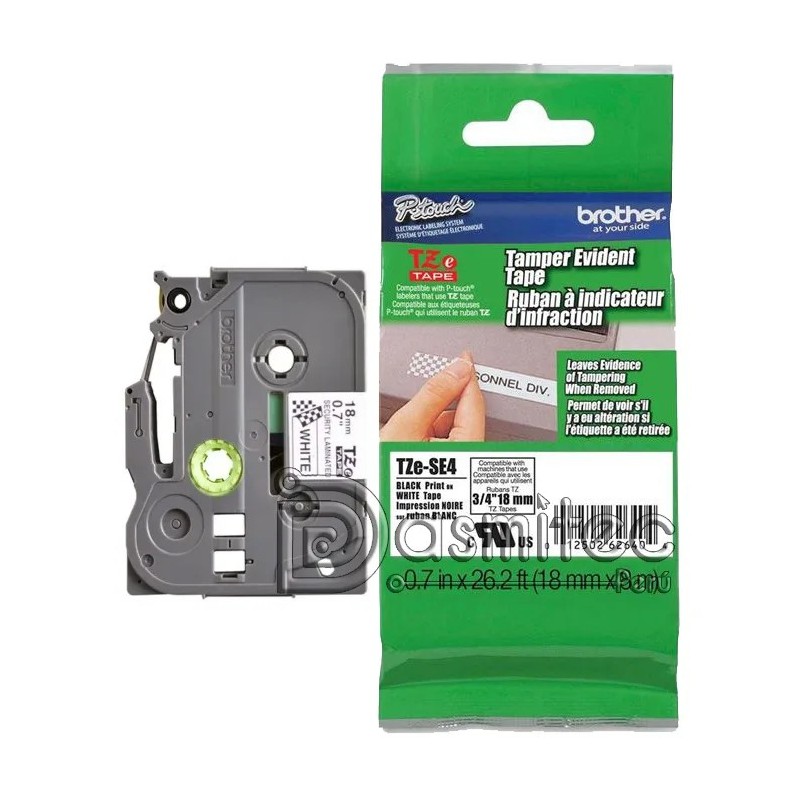 La Cinta Brother TZe-SE4 es el estándar de oro para la protección de bienes y activos con rotuladoras P-touch. Con sus dimensiones ideales de 18mm de ancho por 8 metros de largo y el contraste clásico de texto negro sobre fondo blanco, esta cinta no solo organiza, sino que garantiza la detección inmediata de cualquier intento de remoción o manipulación. Su relación precio/calidad es insuperable, ofreciéndole un acabado impecable con una capa de seguridad esencial.