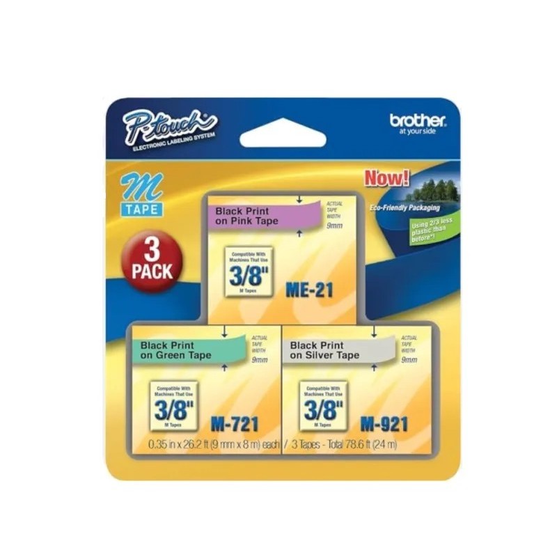 ¡El paquete de cintas ideal para la organización creativa y la codificación por colores en el hogar y la oficina! La referencia ME-793 es un set de tres cartuchos de la serie ME/M, ofreciendo una solución económica y versátil para etiquetado básico. Cada cinta mide 9mm de ancho por 8 metros de largo y presenta texto negro sobre tres fondos de color distintos.