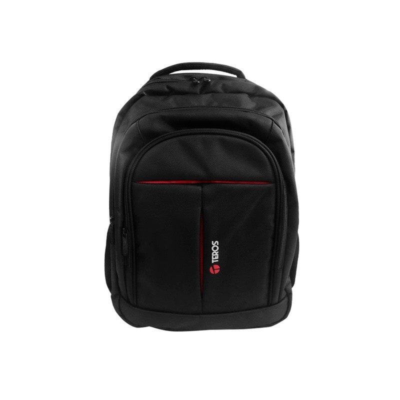 Mochila Teros TE-IDS18560 Para Notebook 15.6", Cuenta con tres cierres externos, el compartimento principal tiene un bolsillo acolchado para notebook de hasta 15.6", el segundo compartimento cuenta con un bolsillo interno enmallado pequeño con cremallera y el tercer compartimento tiene tres pequeños bolsillos para accesorios. Cuenta con dos bolsillos laterales para botellas. Diseño en color negro con dos ribetes rojos de contraste en forma de "T". Espalda, asa superior y correas traseras acolchadas para mayor comodidad.